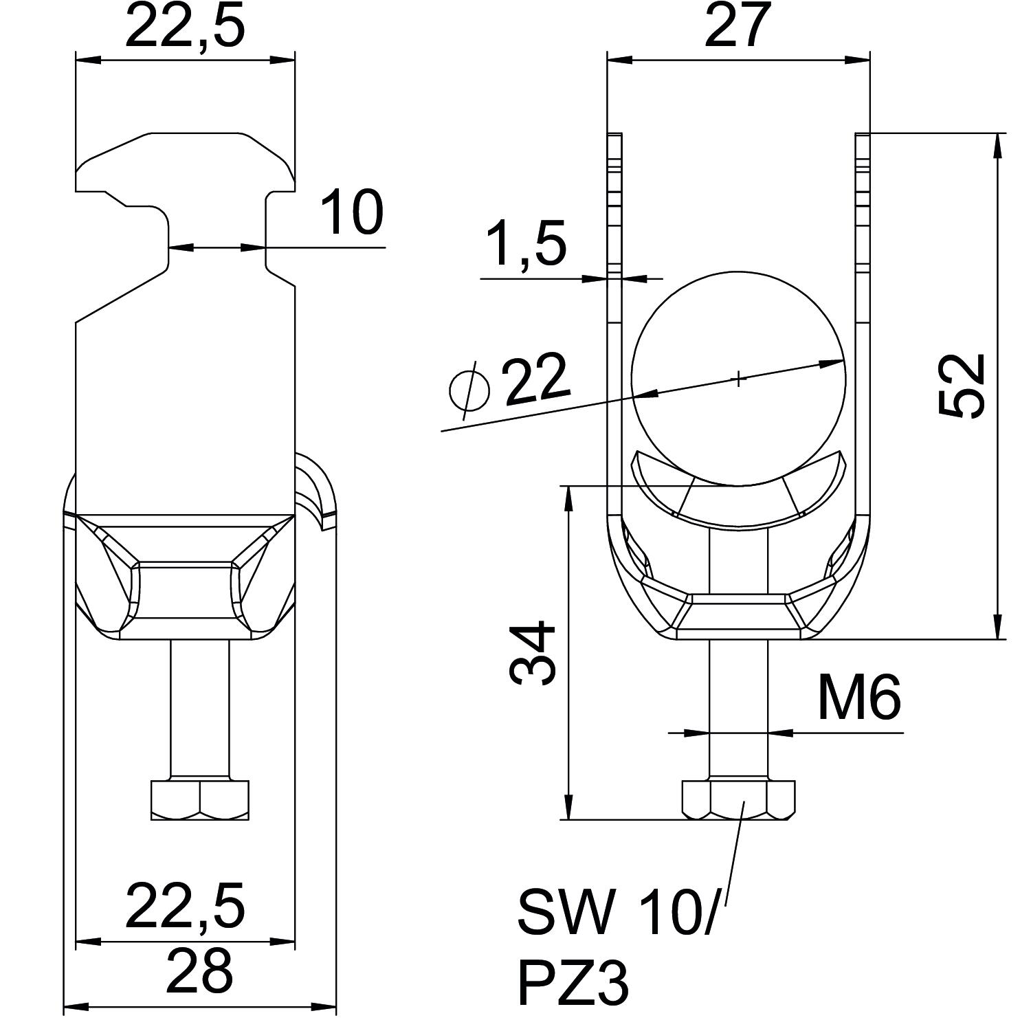 Description du produitBride de fixation avec embase à tête en marteau, plaque de pression en métal avec bords arrondis pour la protection des câbles. Pour montage vertical et horizontal d’1 câble individuel sur des rails profilés en C. Pour une ouverture de 16 – 17 mm. Avec vis à 1 filet sur plaque de pression, tête de vis hexagonale universelle SW10, avec fente et empreinte cruciforme. Convient au montage en intérieur et en extérieur. L’utilisation d’une contre-plaque est recommandée.
