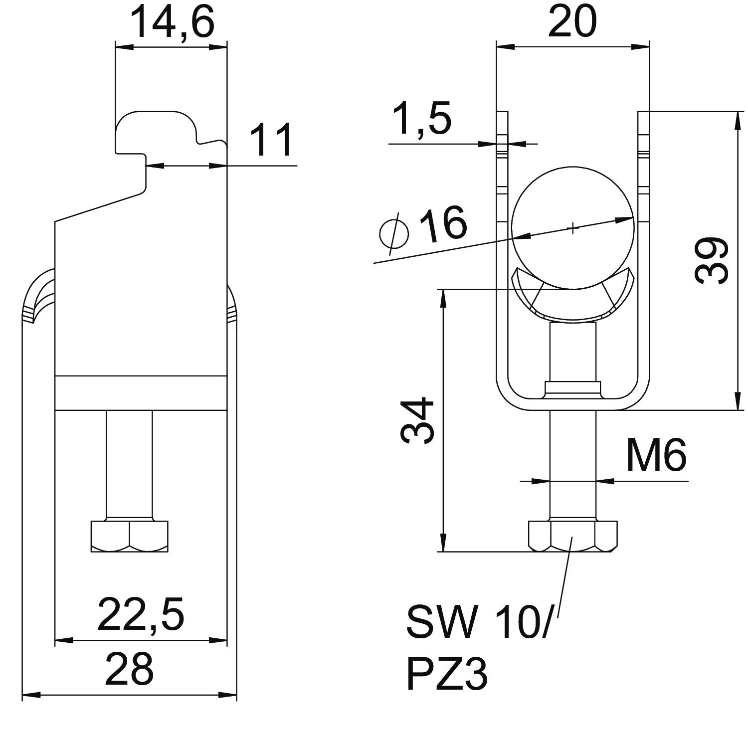 Avec carter en plastique non Avec carter métallique oui Cote A 22,5 mm Cote B 20 mm Cote c 28 mm Cote L 34 mm Cote t 1,5 mm Dimension 12-16mm Dimension G (mm) M6 Dimension H 39 mm Empreinte CO2 (GWP) du berceau à la porte 0,2268 kg CO2e / 1 Pièce Épaisseur de tôle 1,5 mm Filetage M6 Hauteur 39 mm Largeur 20 mm Longueur 22,5 mm Longueur dimensions extérieures 28 mm Matériau acier inoxydable 1.4301 max. Couple de serrage 3 Nm Nombre de câbles/tubes 1 Ouverture 10 mm Plage de serrage D max. 16 mm Plage de serrage D min. 12 mm pour diamètre de tube max. 16 mm pour diamètre de tube min. 12 mm Pour rail avec largeur de fente (avec intervalle) max. 12 mm Pour rail avec largeur de fente (avec intervalle) min. 11 mm Sans halogène oui Supplément matériau Acier inoxydable Supplément surface non traité Surface nu, traité Type de montage Rail profilé - Tous les types