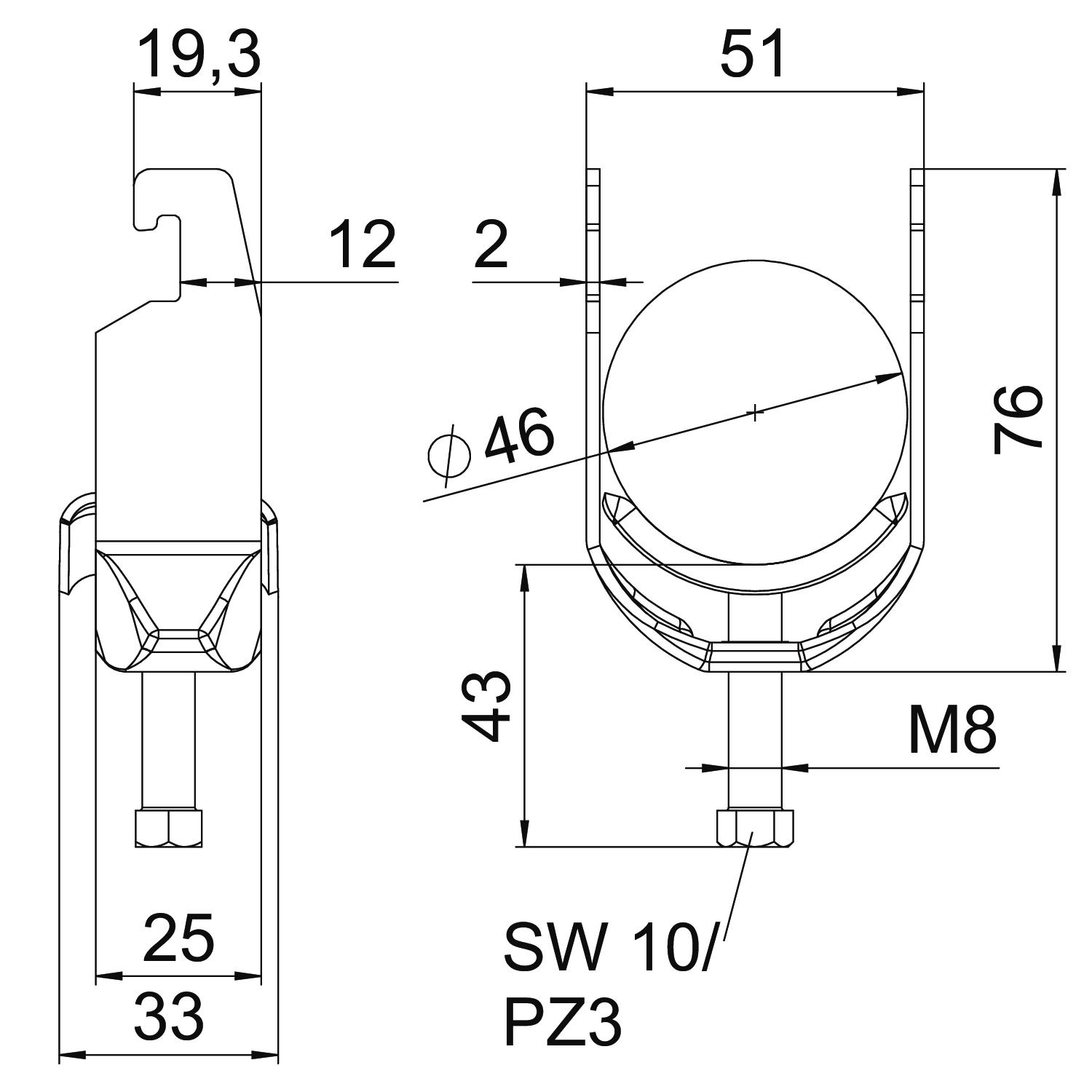 Avec carter métallique oui Cote A 25 mm Cote B 51 mm Cote c 33 mm Cote L 43 mm Cote t 2 mm Dimension 40-46mm Dimension G (mm) M8 Dimension H 76 mm Empreinte CO2 (GWP) du berceau à la porte 0,5775 kg CO2e / 1 Pièce Épaisseur de tôle 2 mm Filetage M8 Hauteur 76 mm Largeur 51 mm Longueur 25 mm Longueur dimensions extérieures 33 mm Matériau acier inoxydable 1.4301 max. Couple de serrage 5 Nm Nombre de câbles/tubes 1 Ouverture 10 mm Plage de serrage D max. 46 mm Plage de serrage D min. 40 mm pour diamètre de tube max. 46 mm pour diamètre de tube min. 40 mm Pour rail avec largeur de fente (avec intervalle) max. 22 mm Pour rail avec largeur de fente (avec intervalle) min. 18 mm Sans halogène oui Supplément matériau Acier inoxydable Supplément surface non traité Surface nu, traité Type de montage Rail profilé - Tous les types
