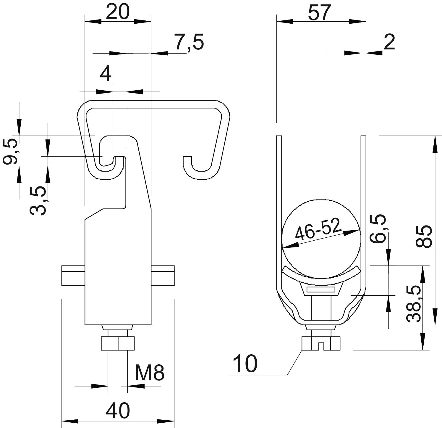 Avec carter en plastique oui Avec carter métallique non Avec contre-plaque non Cote A 20 mm Cote B 57 mm Cote c 40 mm Cote L 38,5 mm Cote t 2 mm Cote x 6,5 mm Dimension 46-52mm Dimension G (mm) M8 Dimension H 85 mm Empreinte CO2 (GWP) du berceau à la porte 0,5239 kg CO₂e / 1 Pièce Matériau acier inoxydable 1.4301 Matériau de la plaque Plastique max. Couple de serrage 5 Nm Nombre de câbles/tubes 1 Plage de serrage D max. 52 mm Plage de serrage D min. 46 mm pour 1 câble H 85 mm pour 1 câble L 38,5 pour diamètre de tube max. 50 mm pour diamètre de tube min. 50 mm Pour rail avec largeur de fente (avec intervalle) max. 22 mm Pour rail avec largeur de fente (avec intervalle) min. 18 mm Qualité du matériau de la plaque Polypropylène Résistant aux chocs non Sans halogène oui Supplément matériau Acier inoxydable Supplément surface non traité Surface nu, traité Type de montage Rail profilé - Tous les types