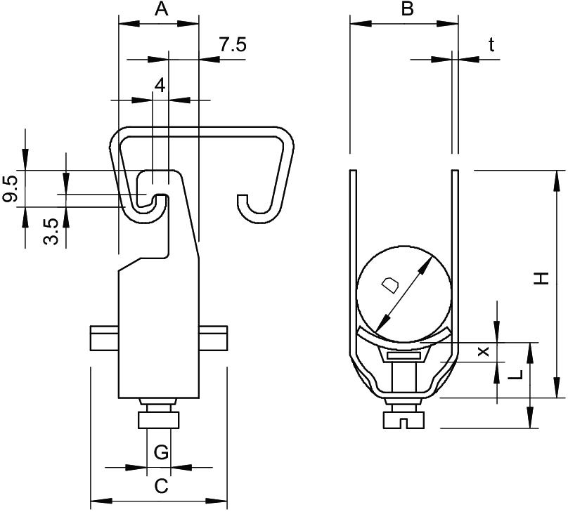 Avec carter en plastique oui Avec carter métallique non Avec contre-plaque non Cote A 20 mm Cote B 51 mm Cote c 40 mm Cote L 37,5 mm Cote t 2 mm Cote x 5,5 mm Dimension 40-46mm Dimension G (mm) M8 Dimension H 79 mm Empreinte CO2 (GWP) du berceau à la porte 0,417 kg CO₂e / 1 Pièce Matériau aluminium Matériau de la plaque Plastique max. Couple de serrage 2 Nm Nombre de câbles/tubes 1 Plage de serrage D max. 46 mm Plage de serrage D min. 40 mm pour 1 câble H 79 mm pour 1 câble L 37,5 pour diamètre de tube max. 40 mm pour diamètre de tube min. 40 mm Pour rail avec largeur de fente (avec intervalle) max. 22 mm Pour rail avec largeur de fente (avec intervalle) min. 18 mm Qualité du matériau de la plaque Polypropylène Résistant aux chocs non Sans halogène oui Supplément matériau aluminium Supplément surface non traité Type de montage Rail profilé - Tous les types