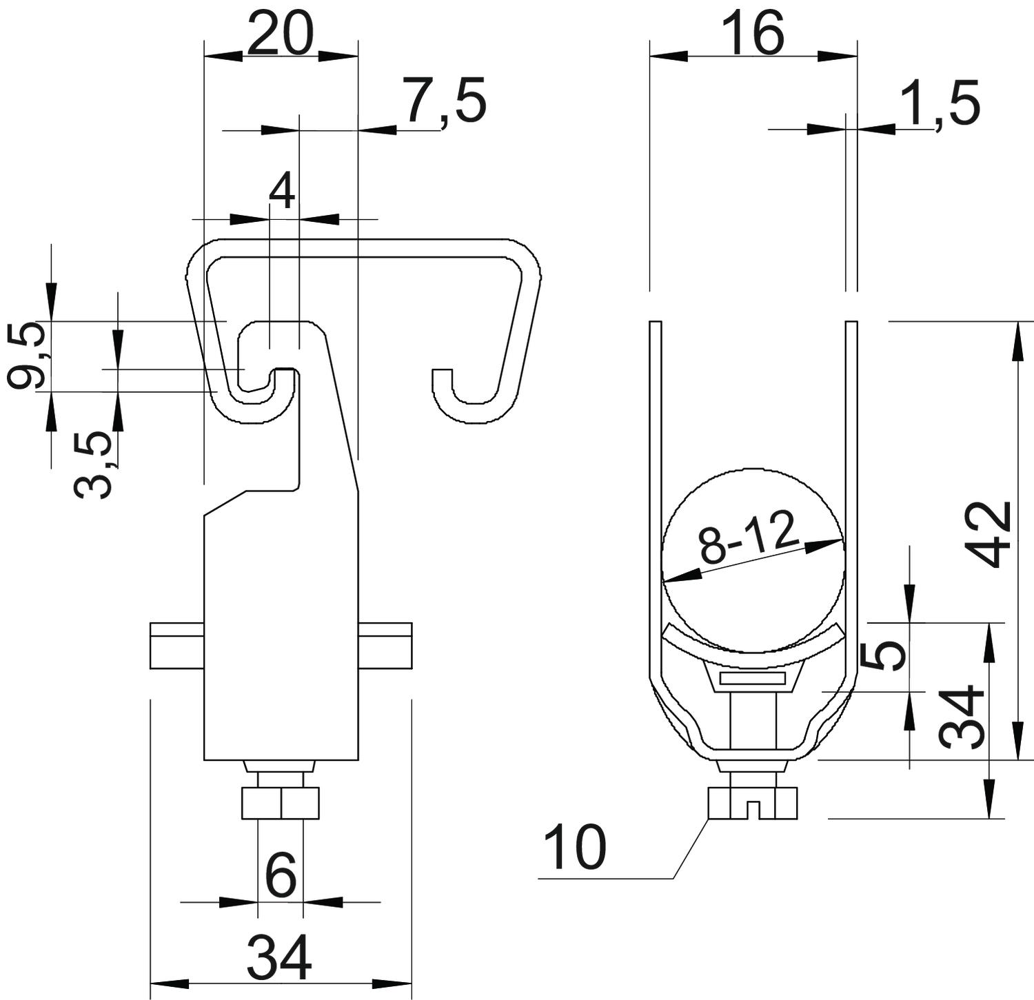 Avec carter en plastique non Avec carter métallique oui Avec contre-plaque non Cote A 20 mm Cote B 16 mm Cote c 34 mm Cote L 34 mm Cote t 1,5 mm Cote x 5 mm Dimension 8-12mm Dimension G (mm) M6 Dimension H 42 mm Empreinte CO2 (GWP) du berceau à la porte 0,0605 kg CO₂e / 1 Pièce Matériau acier Matériau de la plaque acier max. Couple de serrage 3 Nm Nombre de câbles/tubes 1 Plage de serrage D max. 12 mm Plage de serrage D min. 8 mm Pour rail avec largeur de fente (avec intervalle) max. 22 mm Pour rail avec largeur de fente (avec intervalle) min. 18 mm Résistant aux chocs non Sans halogène non Supplément matériau acier Supplément surface galvanisé à chaud Surface galvanisé à chaud par trempage Type de montage Rail profilé - Tous les types