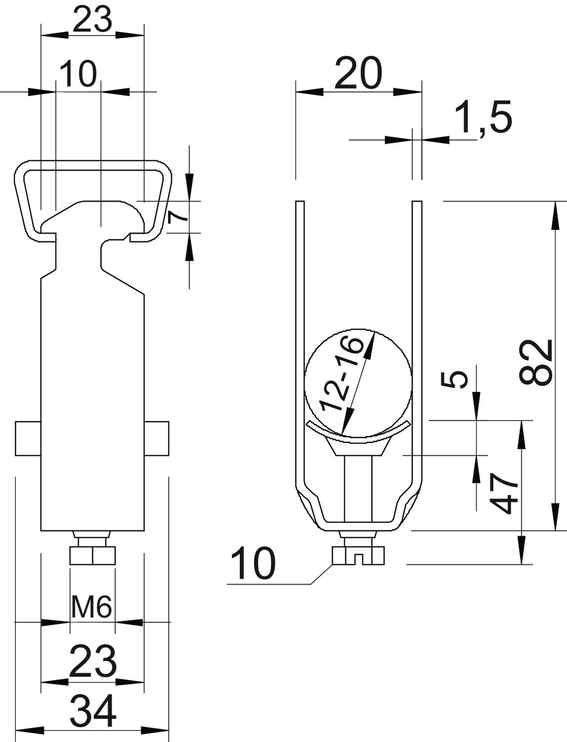 Avec carter en plastique oui Avec carter métallique non Avec contre-plaque non Cote A 23 mm Cote B 20 mm Cote c 34 mm Cote L 47 mm Cote t 1,5 mm Cote x 5 mm Dimension 12-16mm Dimension G (mm) M6 Dimension H 82 mm Empreinte CO2 (GWP) du berceau à la porte 0,1151 kg CO₂e / 1 Pièce Matériau acier Matériau de la plaque Plastique max. Couple de serrage 3 Nm Nombre de câbles/tubes 3 Plage de serrage D max. 16 mm Plage de serrage D min. 12 mm Pour rail avec largeur de fente (avec intervalle) max. 17 mm Pour rail avec largeur de fente (avec intervalle) min. 16 mm Qualité du matériau de la plaque Polypropylène Résistant aux chocs non Sans halogène oui Supplément matériau acier Supplément surface galvanisé à chaud Surface galvanisé à chaud par trempage Type de montage Rail profilé - Tous les types