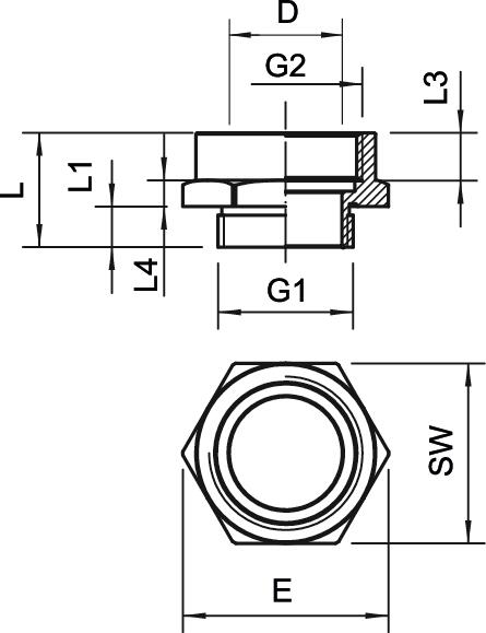 antiesplosione no Apertura di chiave 30 Dimensione e 33,5 mm Dimensione D 18,5 mm Dimensione L 18,5 mm Dimensione L1 6,6 mm Dimensione L3 9,5 mm Dimensione L4 4,3 mm Dimensionee PG16-M25 Impronta CO2 (GWP) dalla culla al cancello 0,087 kg CO2e / 1 Pezzo Materiale Ottone Misura filettatura metrica interna 25 Misura filettatura PG esterna 16 nichelato sì Superficie nichelato Tipo filettatura esterna PG Tipo filettatura interna metrica - Tutti i tipi