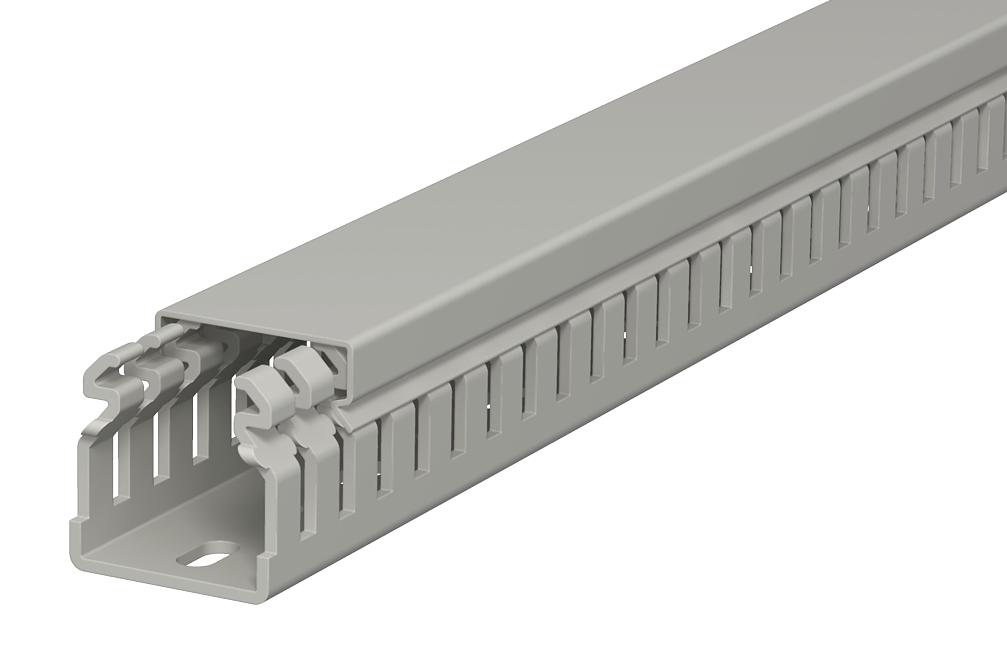 Canale di cablaggio a norma DIN EN 50085-2-3, incl. parte superiore e foratura nel fonfo per posa orizzontale e verticale di cavi e linee elettriche nel quadro elettrico. Versione come canale DIN. La separazione delle linguette avviene senza utensili. Versione a filo possibile tramite punti di rottura predeterminati. Controllato secondo DIN EN 50085-2-3. Lunghezze speciali su richiesta.