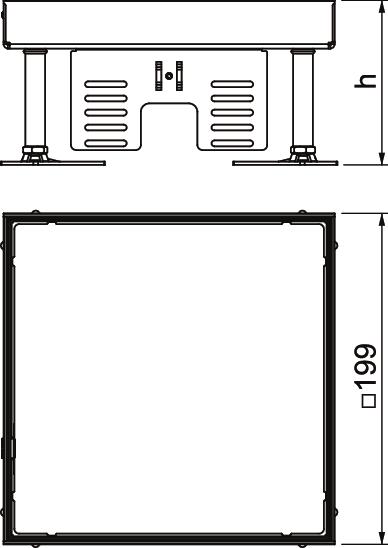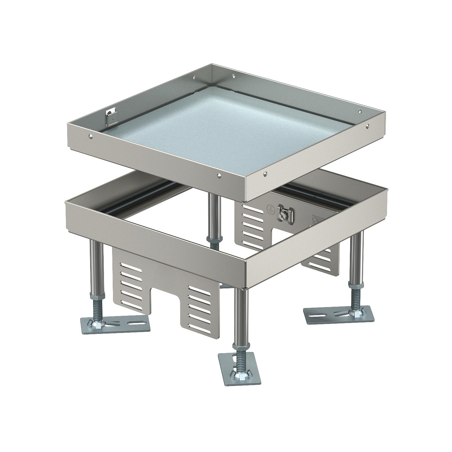 Descrizione del prodottoCassetta livellabile "cieca" quadrata di dimensione nominale 4, per creare un'apertura d'ispezione; da installare nel sistema di condotti in pavimenti sopraelevati e con intercapedini, in pavimenti trattati a secco o umido in ambienti interni. Adatto solo per pavimenti lisci. Livello di protezione: IP X5.