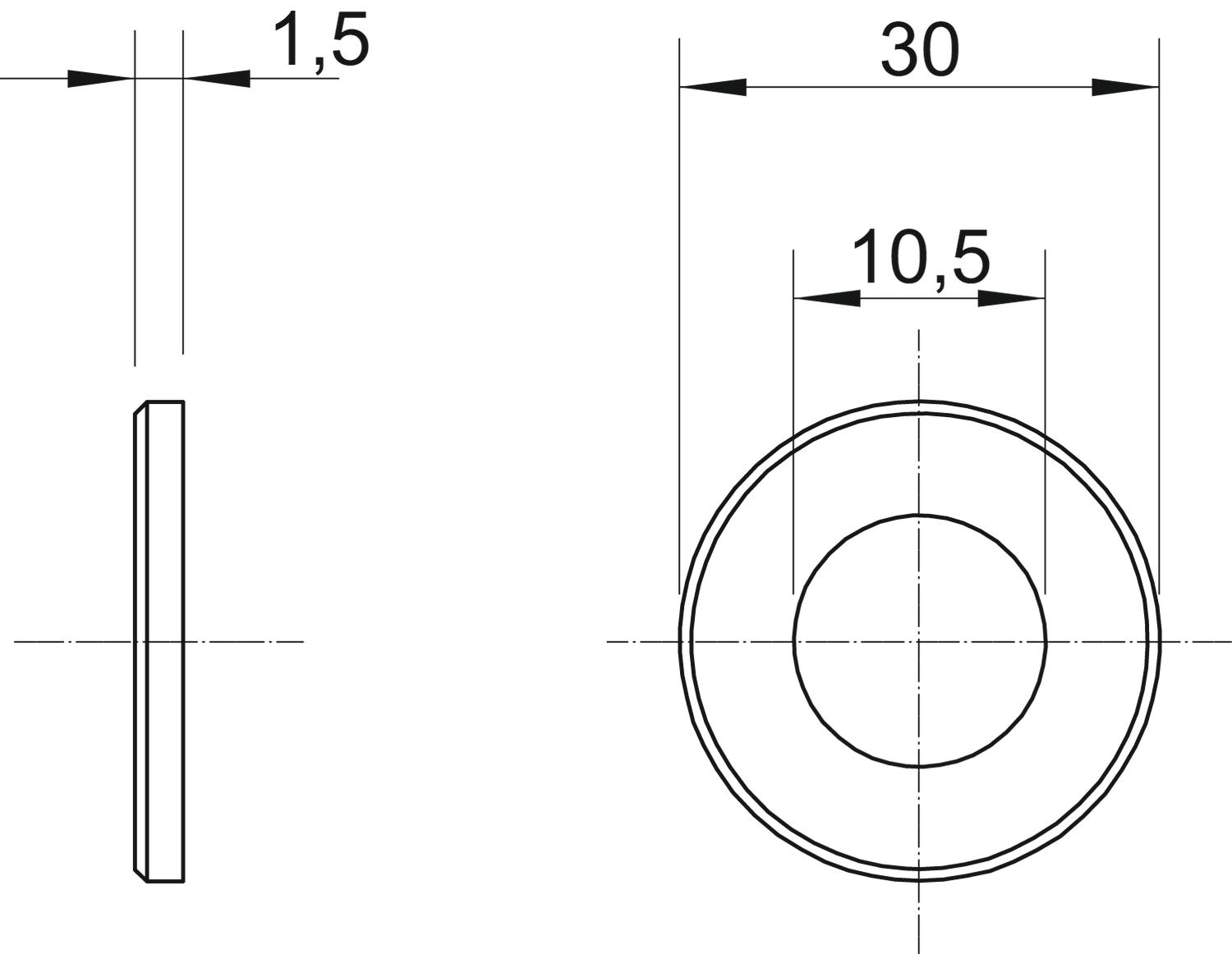 Dimensione d 10,5 mm Dimensione d max. 30 mm Dimensione d min. 30 mm Dimensione H 1,5 mm Dimensionee M10,Ø30mm Filettatura M10 Impronta CO2 (GWP) dalla culla al cancello 0,0287 kg CO2e / 1 Pezzo Materiale Acciaio, inox Priva di alogeni no Spessore lamiera 0,06 in Spessore materiale 1,5 mm Superficie non trattato, ulteriore trattamento - Tutti i tipi