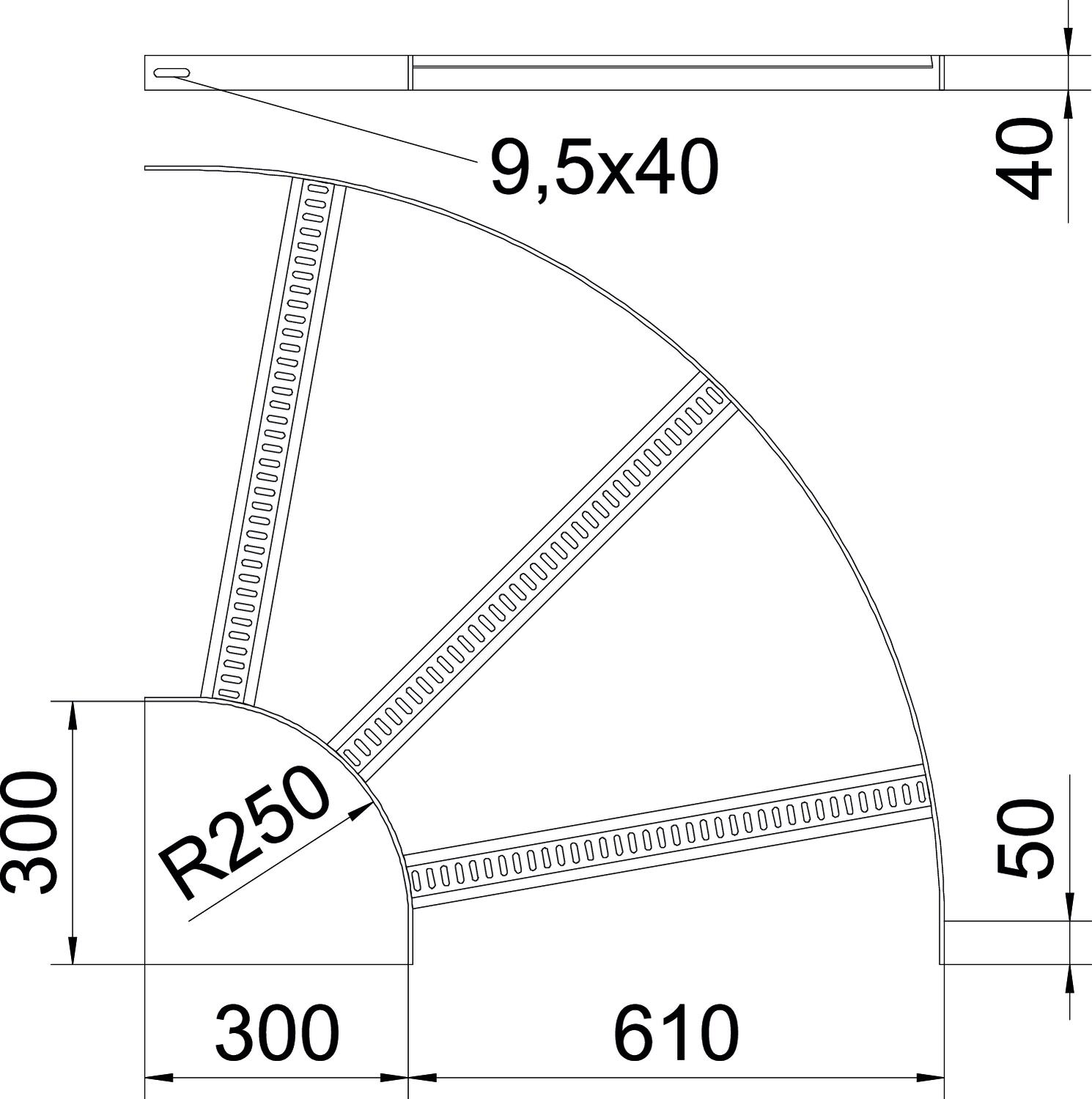 Descrizione del prodottoCurva di 90° per passerelle per impianti navali di tipo SL 62 con altezza laterale di 40 mm, con pioli trapezoidali saldati, forati e aperti verso il basso.