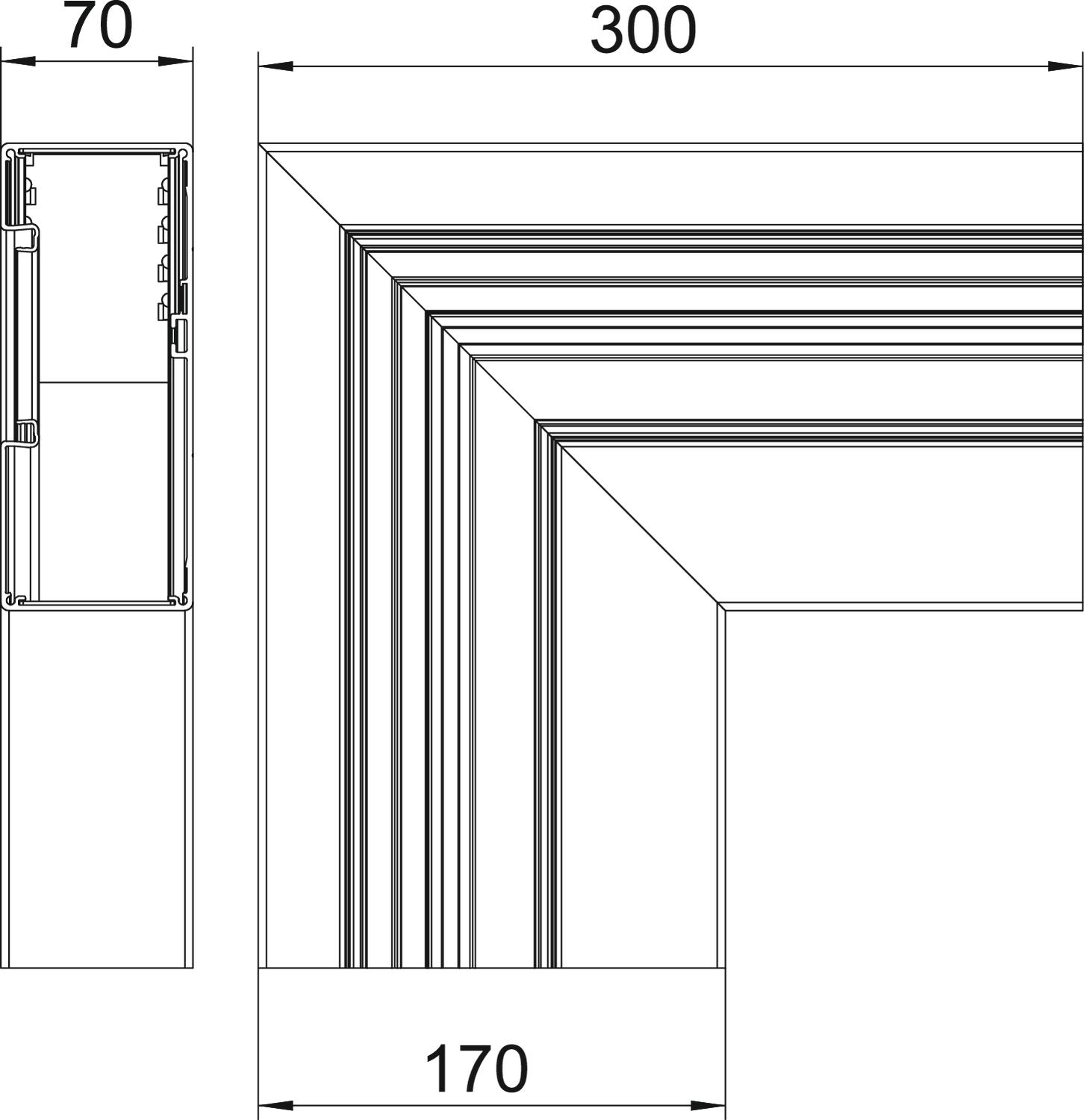 Altezza 70 mm Area ad angolo min. 90 mm Colore bianco; RAL 9010 Deviazione di direzione verticale in discesa Dimensionee 70x170x300 Foro di montaggio nel pavimento no Giunto canale no Grado di protezione IP30 Grado di protezione IK-Code IK10 Graffa ferma cavo no Impronta CO2 (GWP) dalla culla al cancello 22,2912 kg CO2e / 1 Pezzo Larghezza 170 mm Larghezza della parte superiore 76,5 mm Lughezza. 300 mm Materiale Alluminio Numero delle parti superiori 1 Pellicola protettiva sì per altezza canale 70 mm per larghezza canale 170 mm Priva di alogeni sì Range di temperatura di esercizio max 60 °C Range di temperatura di esercizio min. -25 °C Simmetrico no Tipo di montaggio delle parti superiori collocato internamente Trattamento antibatterico no Versione Parte inferiore - Tutti i tipi