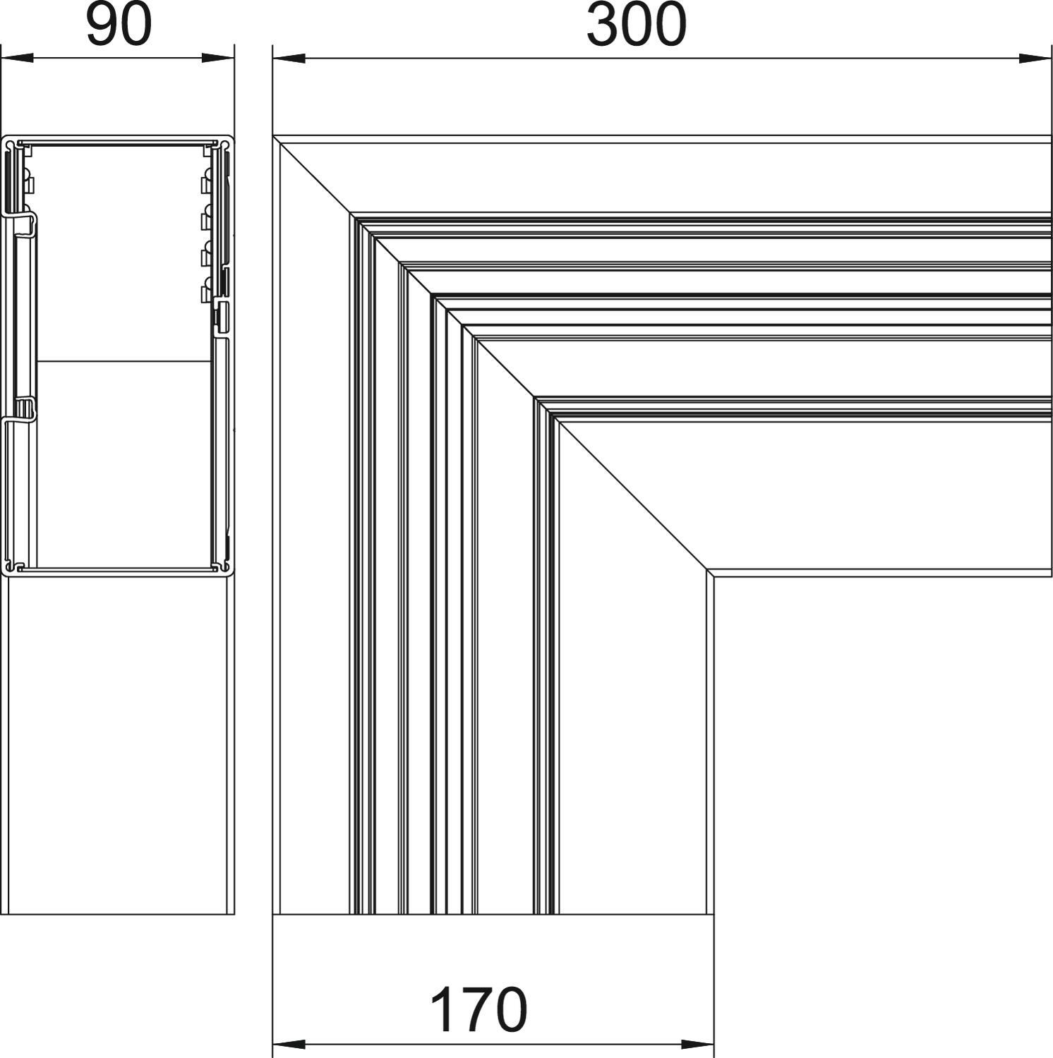Altezza 90 mm Area ad angolo min. 90 mm Colore alluminio Deviazione di direzione verticale in discesa Dimensionee 90x170x300 Foro di montaggio nel pavimento no Giunto canale no Grado di protezione IP30 Grado di protezione IK-Code IK10 Graffa ferma cavo no Impronta CO2 (GWP) dalla culla al cancello 24,1754 kg CO2e / 1 Pezzo Larghezza 170 mm Larghezza della parte superiore 76,5 mm Lughezza. 300 mm Materiale Alluminio Numero delle parti superiori 1 Pellicola protettiva sì per altezza canale 90 mm per larghezza canale 170 mm Priva di alogeni sì Range di temperatura di esercizio max 60 °C Range di temperatura di esercizio min. -25 °C Simmetrico no Superficie anodizzato Tipo di montaggio delle parti superiori collocato internamente Trattamento antibatterico no Versione Parte inferiore - Tutti i tipi