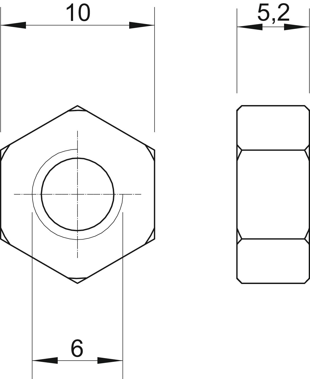 Apertura di chiave 10 Autobloccante no Con flangia no Dimensione d 6 mm Dimensione H 5,2 mm Dimensionee M6 Filettatura M6 Filettatura imperiale 1/4 pollice Filettatura metrica 6 Filettatura sinistra no Impronta CO2 (GWP) dalla culla al cancello 0,0106 kg CO2e / 1 Pezzo Materiale Acciaio, inox Priva di alogeni sì Sistema a vite dado Esagonale esterno Superficie non trattato, ulteriore trattamento Tipo filettatura metrica Versione dado Dado - Tutti i tipi