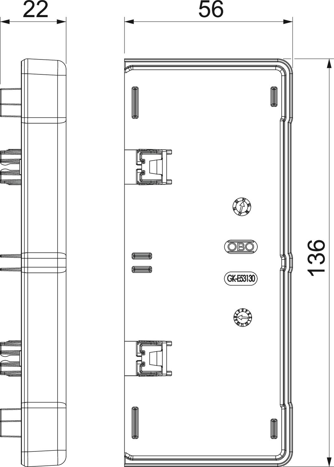 Altezza 56 mm Colore bianco; RAL 9010 Dimensionee 136x56x22 Grado di protezione IP40 Grado di protezione IK-Code IK08 Impronta CO2 (GWP) dalla culla al cancello 0,226 kg CO2e / 1 Pezzo Larghezza 136 mm Lughezza. 22 mm Materiale Policarbonato/acrilnitrile butadiene stirolo Pellicola protettiva no per altezza canale 53 mm per larghezza canale 130 mm Priva di alogeni sì Range di temperatura di esercizio max 60 °C Range di temperatura di esercizio min. -15 °C Rivesti. sezioni sì Telai sinistro/destro Tipo di fissaggio rimovibile Trattamento antibatterico no Versione Simmetrico - Tutti i tipi