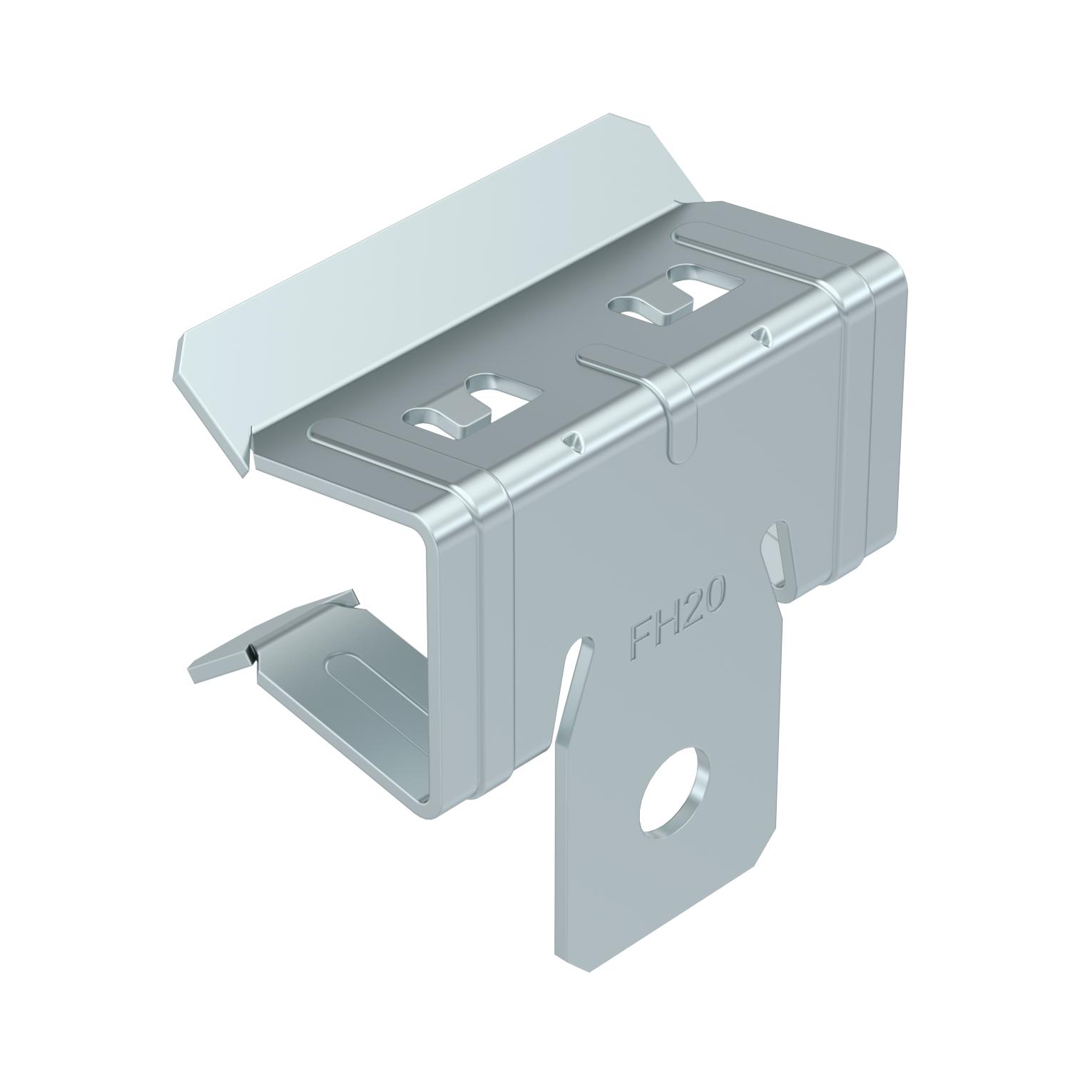 Descrizione del prodottoGraffa di supporto con foro per specifiche soluzioni di montaggio, ad esempio per l'attacco di ganci a S o di catene. Fissaggio a putrelle in acciaio tramite innesto.