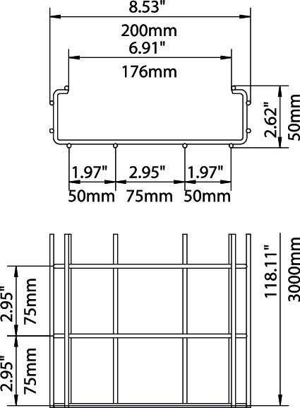 Descrizione del prodottoPasserella grigliata con forma a C composta da fili in acciaio saldati a punto, altezza del bordo 50 mm.