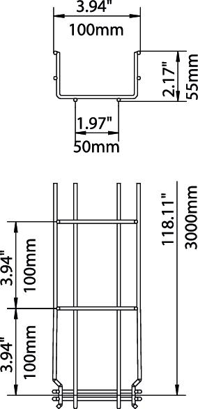 Per la passerella grigliata non sono necessari ulteriori componenti di collegamento, le due estremità vengono semplicemente inserite una nell'altra. La larghezza della maglia è di 50 x 100 mm (eccezione GRM 55/50 = 20 x 100 mm).