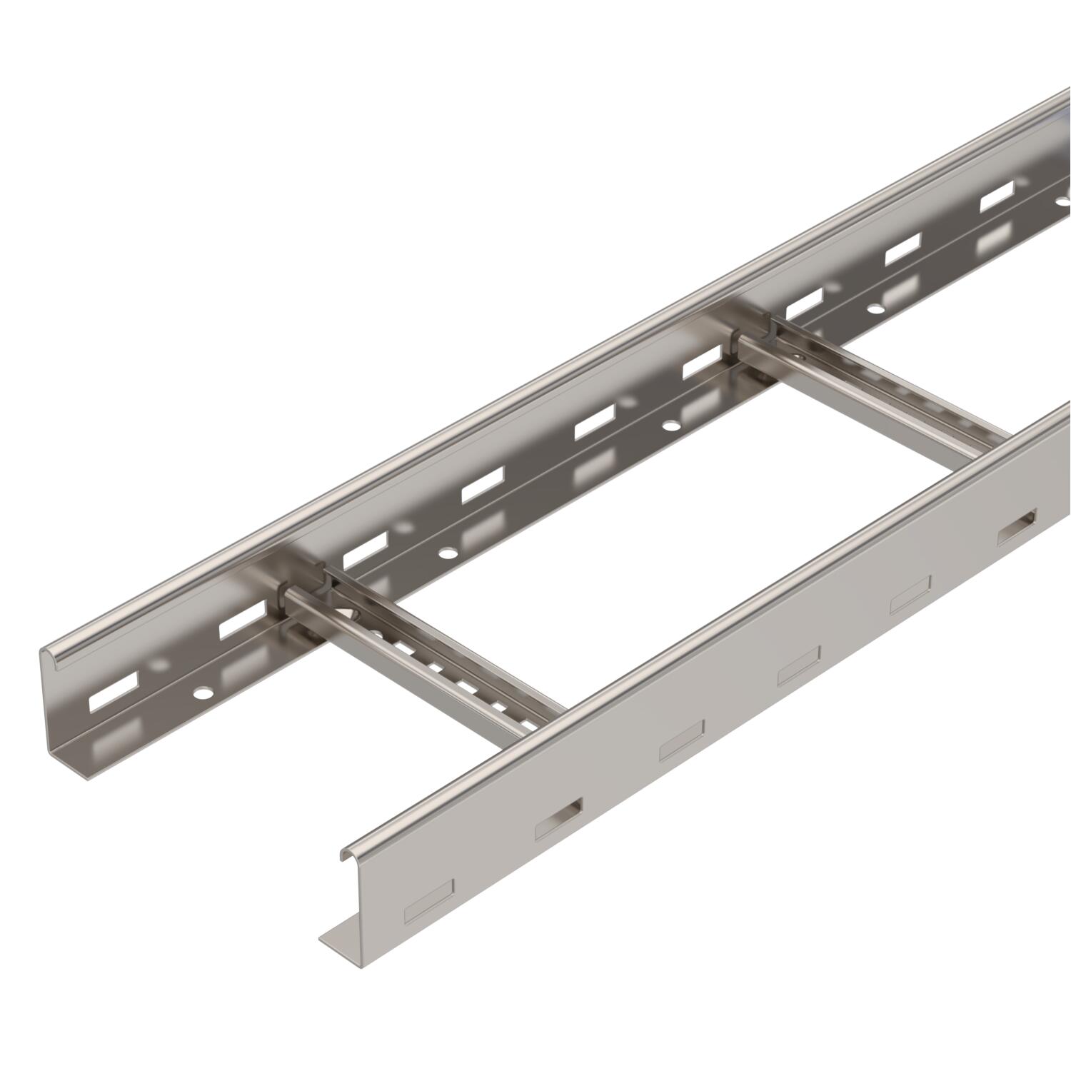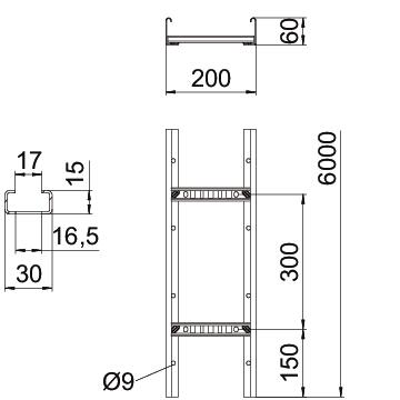 Descrizione del prodottoPasserella con bordo di altezza pari a 60 mm saldata, con pioli del profilato a C, larghi 30 mm con scanalatura verso l'alto. Longherone laterale arrotondato come rinforzo e protezione dei bordi. Il fissaggio alla mensola viene eseguito con morsetti tipo LKS 40. La misura della scanalatura del piolo è pari a 16,5 mm, la staffa reggicavo è il tipo 2056.