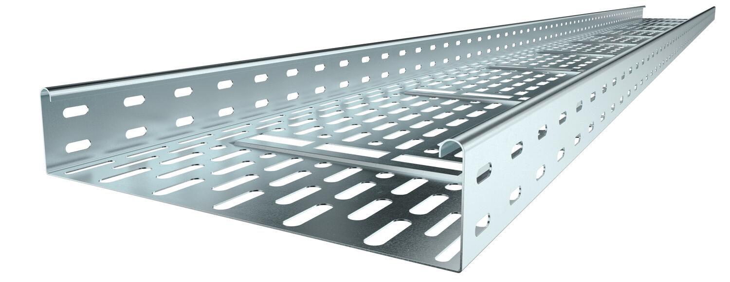 Sistema di passerelle portacavi asolate conforme a VdS 2092 con il 30% di percentuale di foratura per l'impiego sotto gli impianti di nebulizzazione.