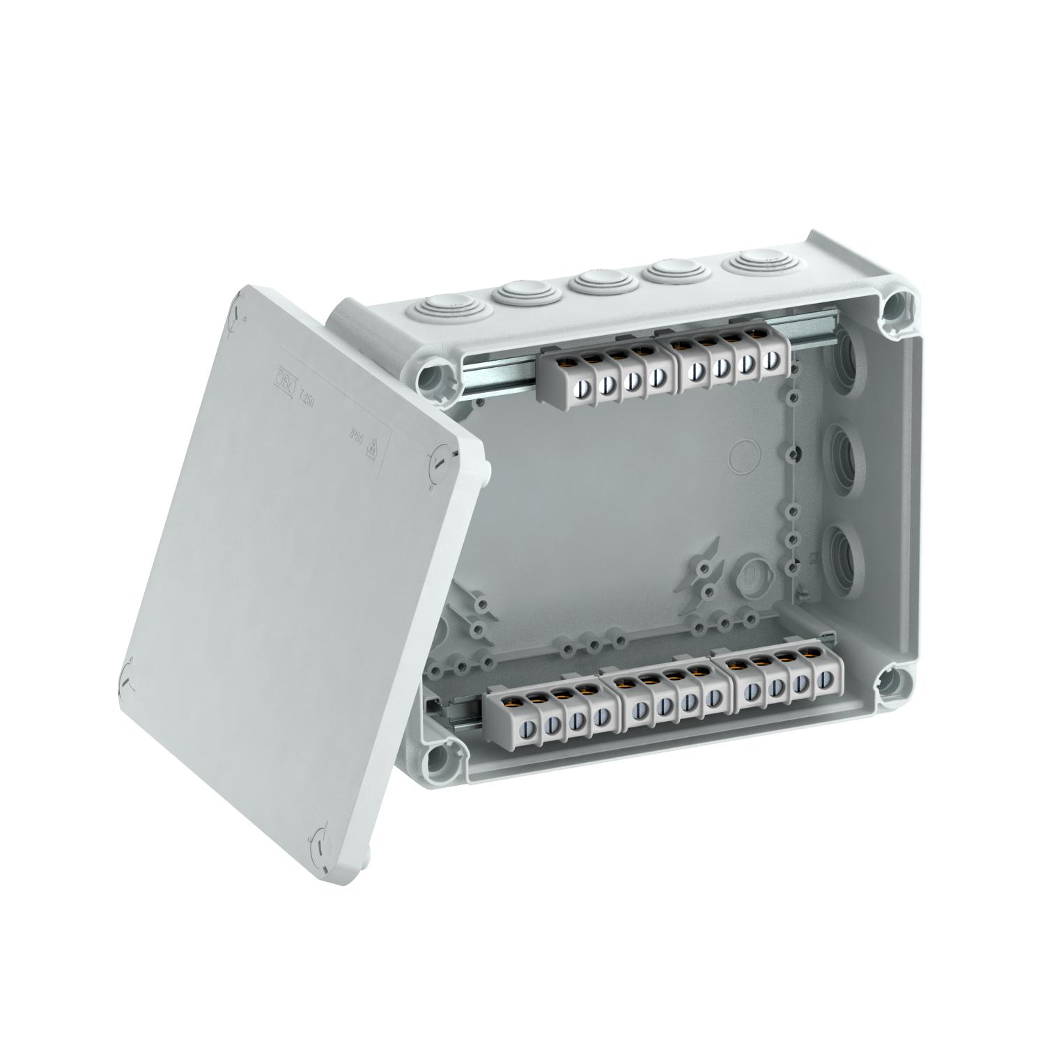Descrizione del prodottoScatola di derivazione con morsettiera per il collegamento di cavi e linee in ambienti interni e ambienti esterni protetti. Forma rettangolare con tenute a innesto sui lati e inserti di deviazione nel fondo. Adatta per il montaggio su pareti e soffitti, il montaggio su piastre di montaggio e filettatura nel pavimento. Con la possibilità di fissaggio interno e montaggio tramite cupole angolari. Coperchio con chiusura rapida, piombabile. Realizzato con materiali privi di alogeni e resistenti ai raggi UV. Scatola di derivazione a norma DIN EN 60670. Ignifugo secondo DIN EN 60695-2-11, temperatura di prova 650 °C. Resistenza agli urti IK05 secondo DIN EN 50102.