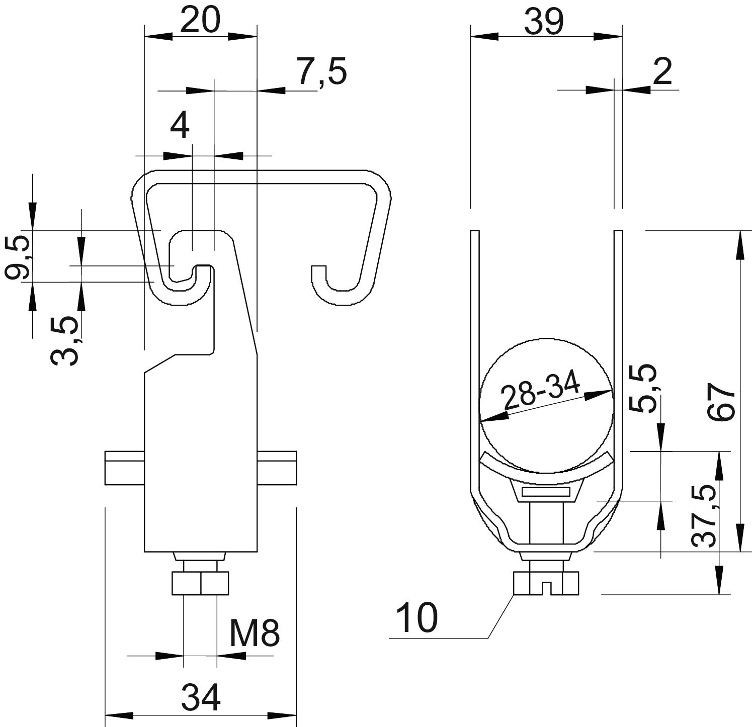 Aggiunta materiale Acciaio Aggiunta superficie zincato a caldo Capacità D max 34 mm Capacità D min. 28 mm Con controcoppa no Con coppa in plastica sì Con coppa metallica no Dimensione A 20 mm Dimensione B 39 mm Dimensione C 34 mm Dimensione G (mm) M8 Dimensione H 67 mm Dimensione L 37,5 mm Dimensione t 2 mm Dimensione x 5,5 mm Dimensionee 28-34mm Impronta CO2 (GWP) dalla culla al cancello 0,1237 kg CO₂e / 1 Pezzo Materiale Acciaio Materiale della coppa Plastica Max Coppia di serraggio 5 Nm Numero dei cavi/tubi 1 per 1 cavo H 67 mm per 1 cavo L 37,5 per 2 cavi H 103 mm per 2 cavi L 44,5 mm per 3 cavi H 139 mm per 3 cavi L 44,5 mm per diametro tubo max 32 mm per diametro tubo min. 32 mm per profilato portacavi con apertura asola (con intervallo) max 22 mm per profilato portacavi con apertura asola (con intervallo) min. 18 mm Priva di alogeni sì Qualità del materiale della coppa Polipropilene Resistente agli urti no Superficie zincato a caldo per immersione Tipo di montaggio Profilati - Tutti i tipi