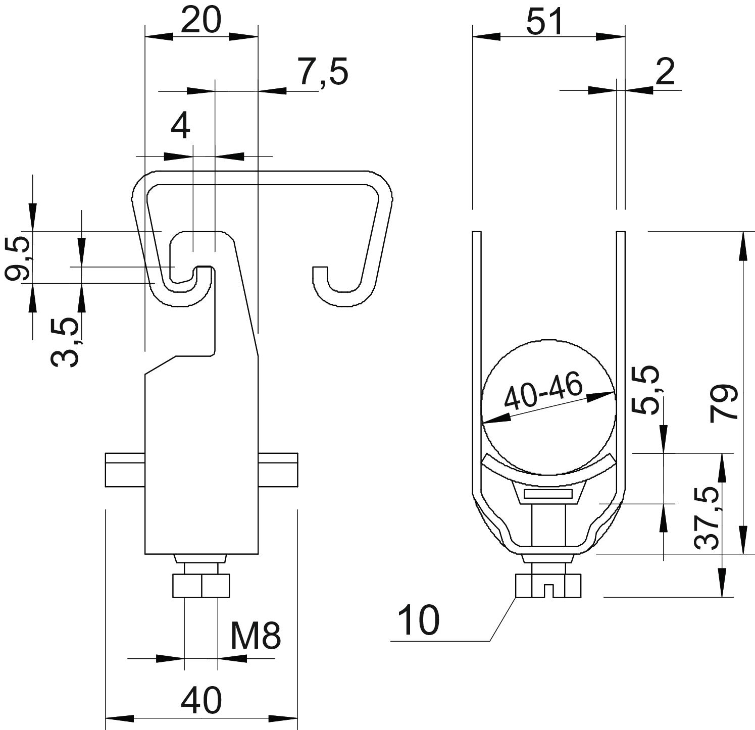 Aggiunta materiale Acciaio Aggiunta superficie zincato a caldo Capacità D max 46 mm Capacità D min. 40 mm Con controcoppa no Con coppa in plastica sì Con coppa metallica no Dimensione A 20 mm Dimensione B 51 mm Dimensione C 40 mm Dimensione G (mm) M8 Dimensione H 79 mm Dimensione L 37,5 mm Dimensione t 2 mm Dimensione x 5,5 mm Dimensionee 40-46mm Impronta CO2 (GWP) dalla culla al cancello 0,1701 kg CO₂e / 1 Pezzo Materiale Acciaio Materiale della coppa Plastica Max Coppia di serraggio 5 Nm Numero dei cavi/tubi 1 per 1 cavo H 79 mm per 1 cavo L 37,5 per 2 cavi H 128 mm per 2 cavi L 44,5 mm per 3 cavi H 177 mm per 3 cavi L 56,5 mm per diametro tubo max 40 mm per diametro tubo min. 40 mm per profilato portacavi con apertura asola (con intervallo) max 22 mm per profilato portacavi con apertura asola (con intervallo) min. 18 mm Priva di alogeni sì Qualità del materiale della coppa Polipropilene Resistente agli urti no Superficie zincato a caldo per immersione Tipo di montaggio Profilati - Tutti i tipi