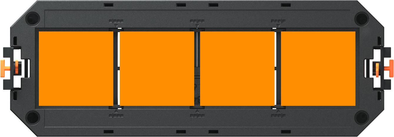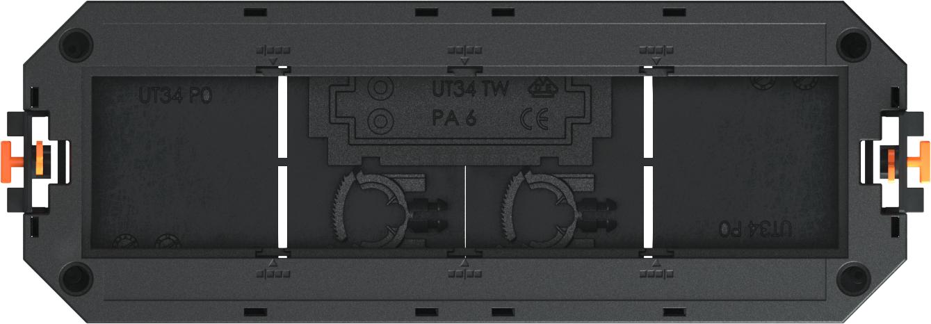Supporto universale con due serracavi, separatore e coperchio UT4 P4 per l'installazione di 4 apparecchi Modul 45 in moduli apparecchi con grandezze nominali R7, R9 e 9.