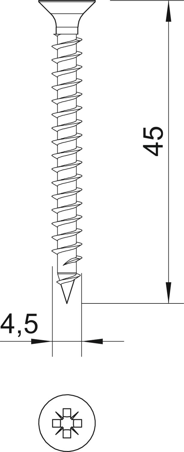 Diametro testa 8,3 mm Dimensione D 4,5 mm Dimensione L 45 mm Dimensionee 4,5x45mm Forma della testa Bulloni filettati interni CD Indurito sì Lughezza. 45 mm Materiale Acciaio Sistema a vite Pozidrive PZ Superficie zincato galvanicamente - Tutti i tipi
