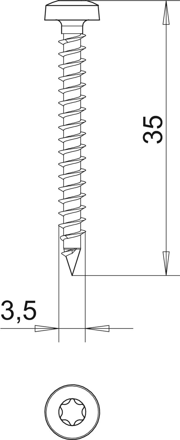 A doppio passo sì Diametro testa 6,5 mm Dimensione D 3,5 mm Dimensione L 35 mm Dimensionee 3,5x35mm Forma della testa NULL Indurito sì Lughezza. 35 mm Materiale Acciaio Sistema a vite Torx Spessore 3,5 mm Superficie zincato galvanicamente - Tutti i tipi