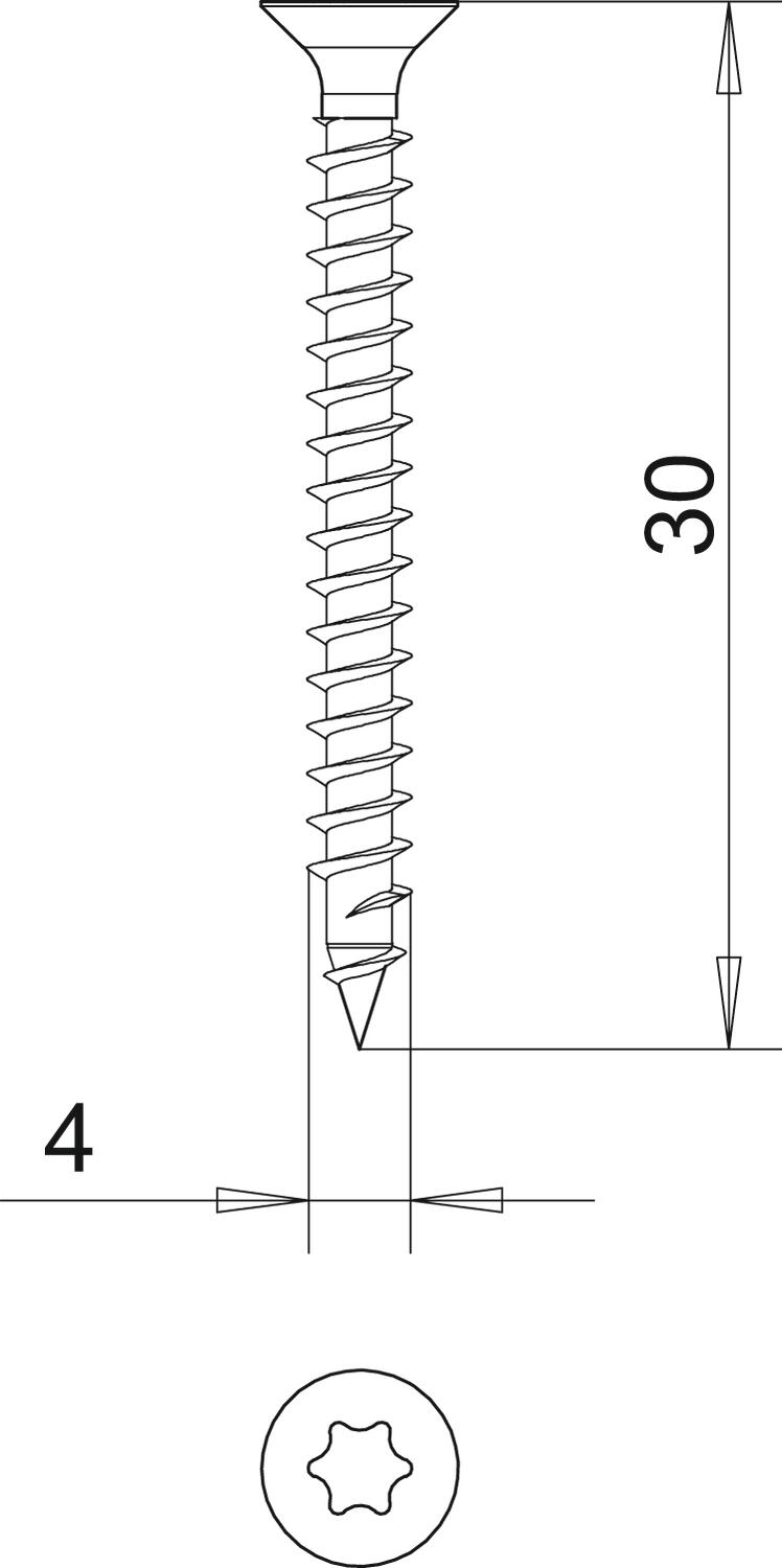 Diametro testa 7,5 mm Dimensione D 4 mm Dimensione L 30 mm Dimensionee 4x30mm Forma della testa Bulloni filettati interni CD Indurito sì Lughezza. 30 mm Materiale Acciaio Sistema a vite Torx Superficie zincato galvanicamente - Tutti i tipi