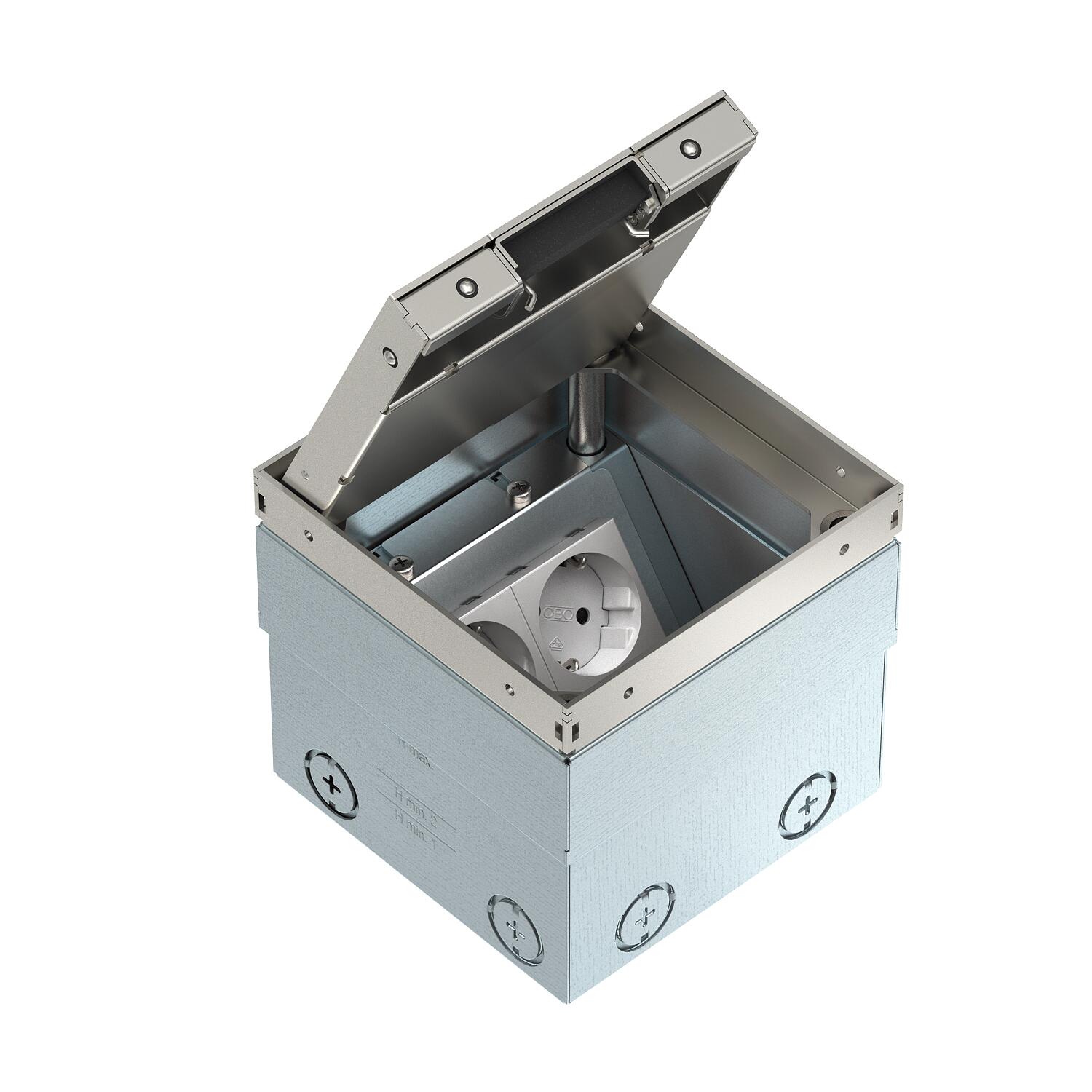 ProduktbeschreibungQuadratische Bodensteckdose für den Einsatz in trocken gepflegten Hohlböden und Estrichböden im Innenbereich. Einbaugehäuse mit vorgeprägten Einführungsöffnungen für Rohre (M20/M25). Oberteil durch 4 Nivellierstützen auf Oberkante Bodenbelag einstellbar. Die Mindesteinbautiefe beträgt 110 mm, der Nivellierbereich + 25 mm.