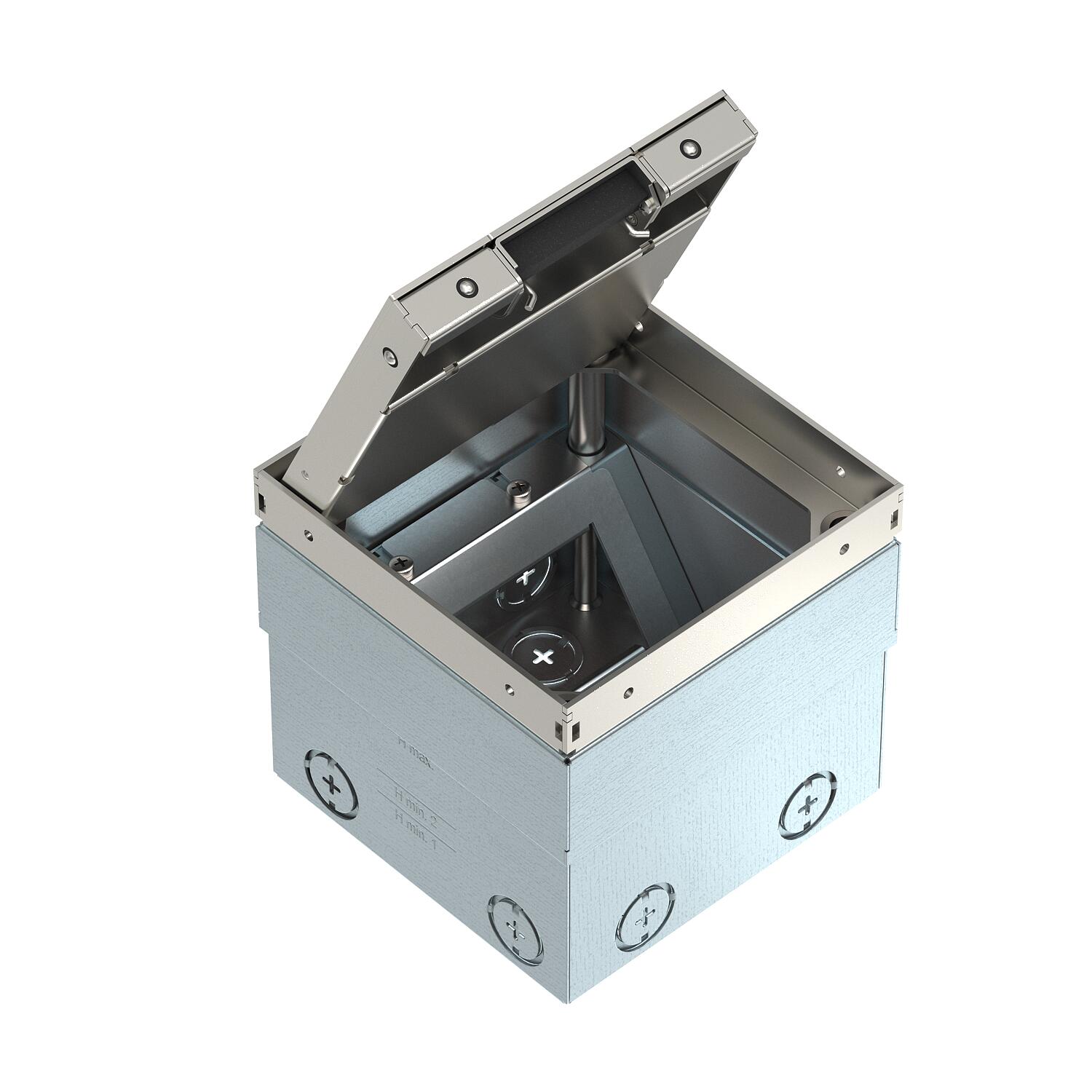 ProduktbeschreibungQuadratische Bodensteckdose für den Einsatz in trocken gepflegten Hohlböden und Estrichböden im Innenbereich. Einbaugehäuse mit vorgeprägten Einführungsöffnungen für Rohre (M20/M25). Oberteil durch 4 Nivellierstützen auf Oberkante Bodenbelag einstellbar. Die Mindesteinbautiefe beträgt 110 mm, der Nivellierbereich + 25 mm.