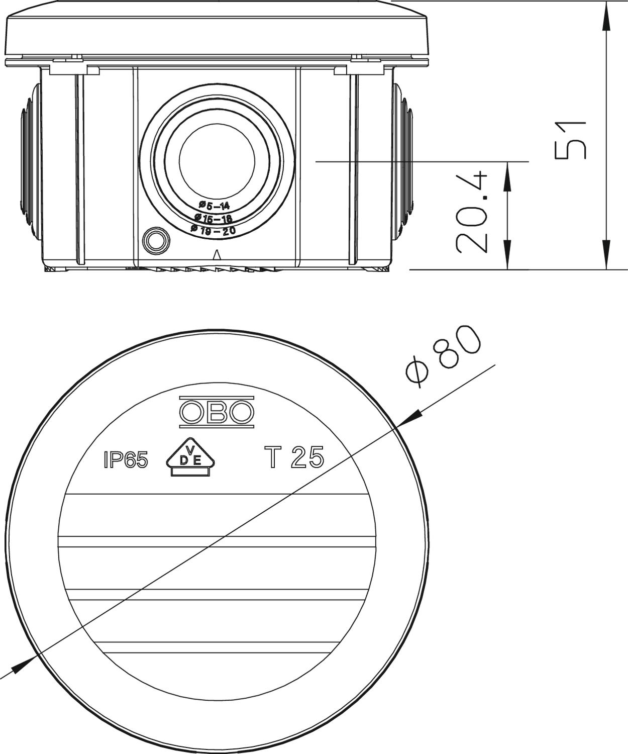 ProduktbeschreibungKabelabzweigkasten zum Verbinden von Kabeln und Leitungen im Innenbereich und geschützten Außenbereichen. Runde Form mit Einsteckdichtungen an den Seiten und Ausschlageinführungen im Boden. Geeignet für die Wand-/ Deckenmontage, die Montage auf Montageblechen und Gewinde im Boden. Mit der Möglichkeit zur Innenbefestigung. Mit festsitzendem Klemmdeckel. Hergestellt aus halogenfreien und UV-resistenten Materialien. Kabelabzweigkasten gemäß DIN EN 60670. Flammwidrig nach DIN EN 60695-2-11, Prüftemperatur 650°C. Schlagfestigkeit IK07 gemäß DIN EN 50102.