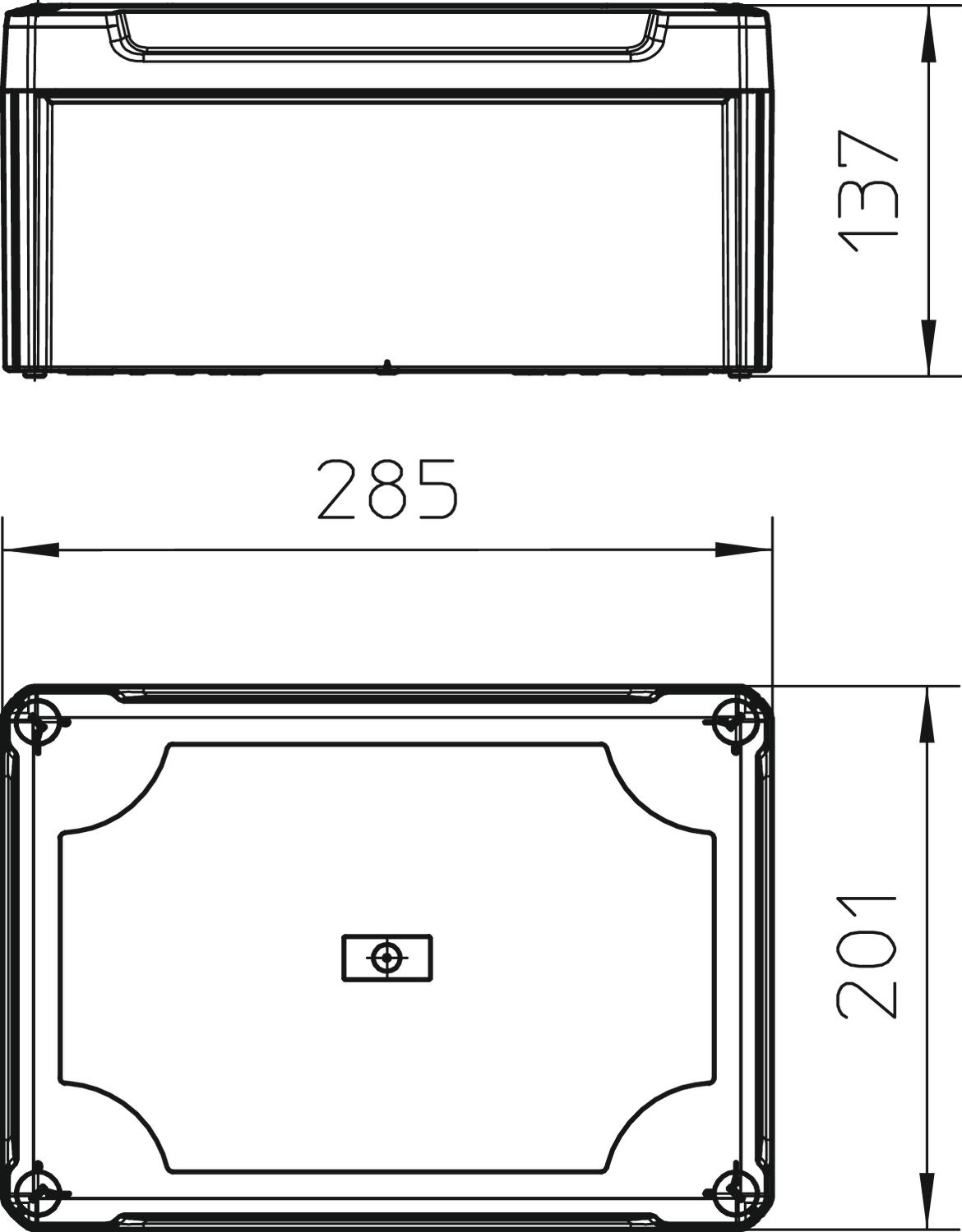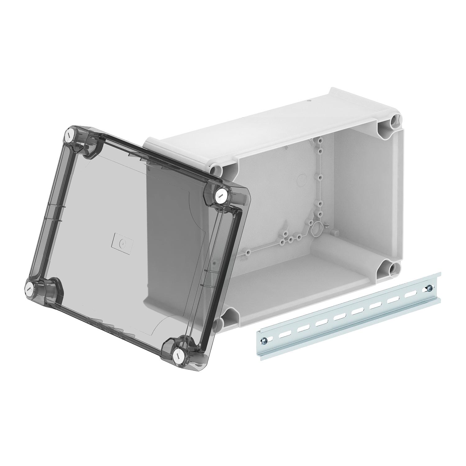 ProduktbeschreibungKabelabzweigkasten geschlossen zum Verbinden von Kabeln und Leitungen im Innenbereich und geschützten Außenbereichen. Rechteckige Form ohne Einführungen. Geeignet für die Wand-/ Deckenmontage, die Montage auf Montageblechen und Gewinde im Boden. Mit der Möglichkeit zur Innenbefestigung und Montage über die Eckdome. Hoher, transparenter Deckel mit Schnellverschluss, plombierbar. Hergestellt aus halogenfreien Materialien.