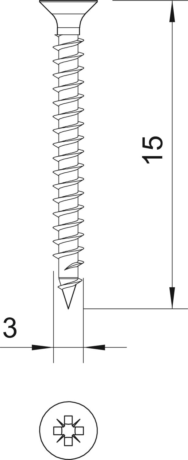 Dimension 3x15mm Gehärtet ja Kopfdurchmesser 5,6 mm Kopfform Senkkopf Länge 15 mm Maß D 3 mm Maß L 15 mm Oberfläche galvanisch verzinkt Schraubsystem Pozidriv PZ Werkstoff Stahl - Alle Typen