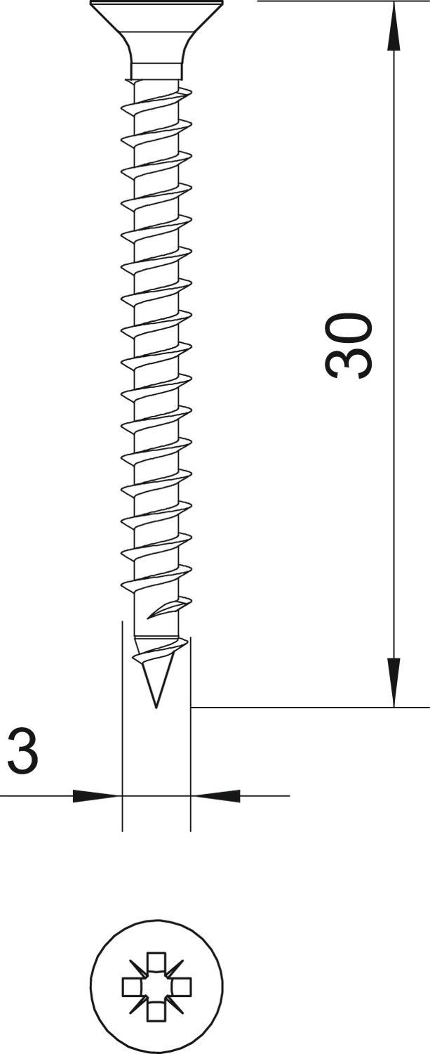 Dimension 3x30mm Gehärtet ja Kopfdurchmesser 5,6 mm Kopfform Senkkopf Länge 30 mm Maß D 3 mm Maß L 30 mm Oberfläche galvanisch verzinkt Schraubsystem Pozidriv PZ Werkstoff Stahl - Alle Typen