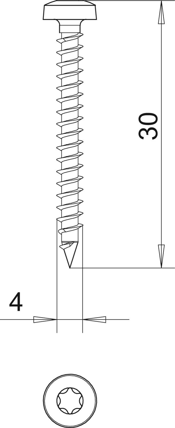 Dimension 4x30mm Gehärtet ja Kopfdurchmesser 7,5 mm Kopfform Panhead Länge 30 mm Maß D 4 mm Maß L 30 mm Oberfläche galvanisch verzinkt Schraubsystem Torx Stärke 4 mm Werkstoff Stahl Zweigängig ja - Alle Typen