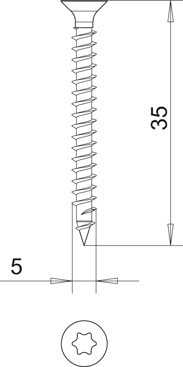 Dimension 5x35mm Gehärtet ja Kopfdurchmesser 9,2 mm Kopfform Senkkopf Länge 35 mm Maß D 5 mm Maß L 35 mm Oberfläche galvanisch verzinkt Schraubsystem Torx Werkstoff Stahl - Alle Typen