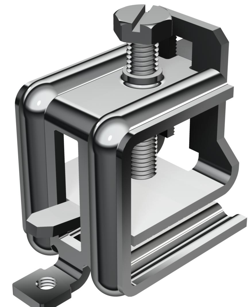 ProduktbeschreibungTrägerschraubklammer zur Befestigung von Bauteilen an Stahlprofilen, mit M6-Gewindebohrung zur Aufnahme von Gewindestangen. Fixierung am Stahlträger oder Flacheisen mit Druckwanne und Sechskantschraube M8, Schlüsselweite 13 mm.